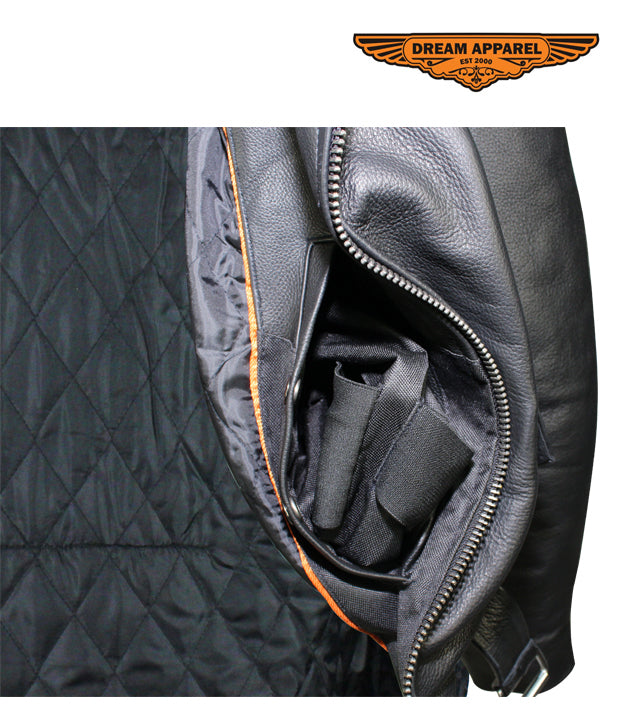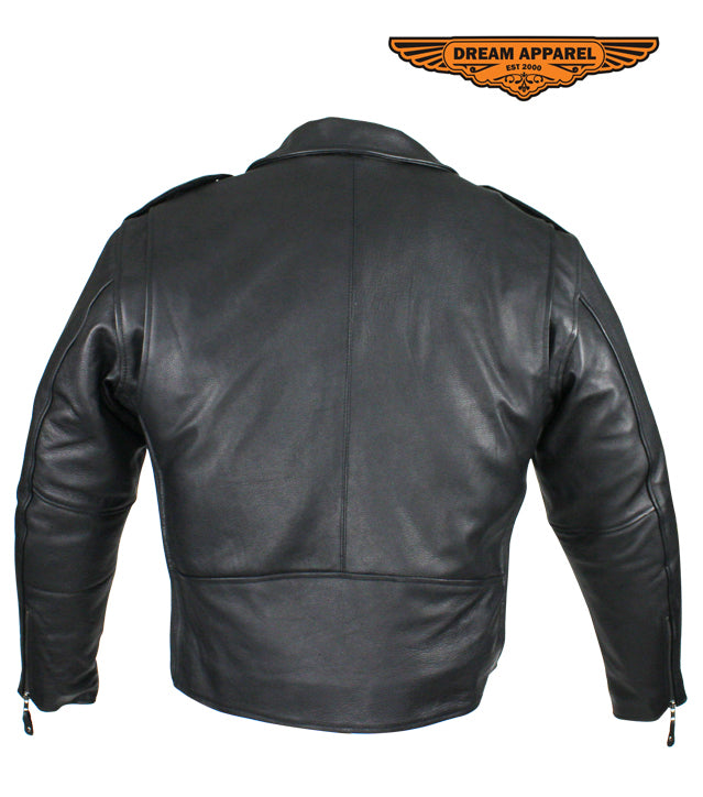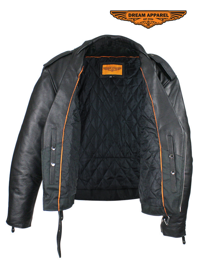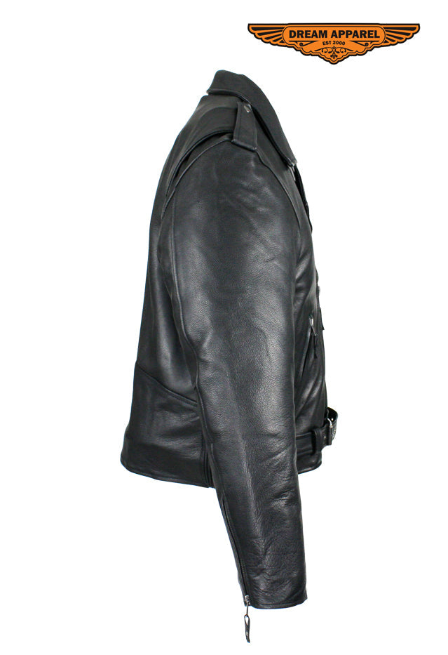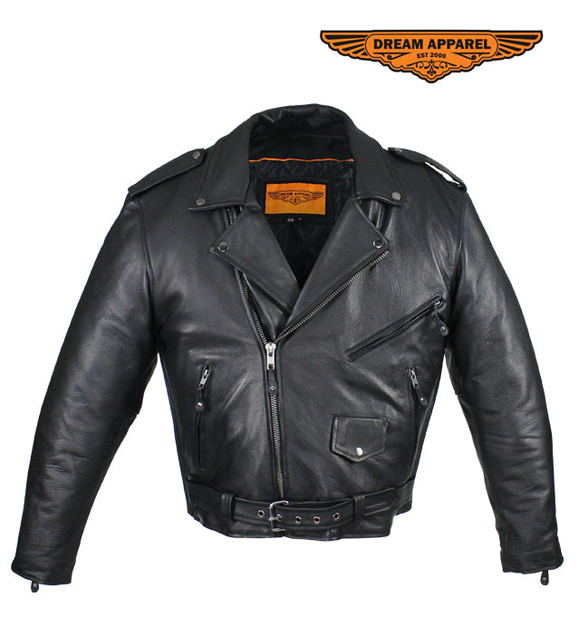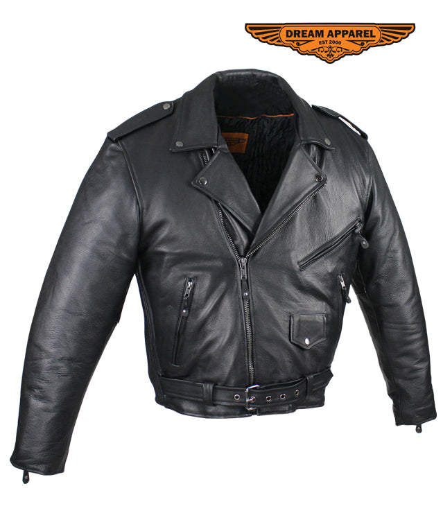 Mens Naked Cowhide Leather Motorcycle Jacket With Snap Down Collar & Belt