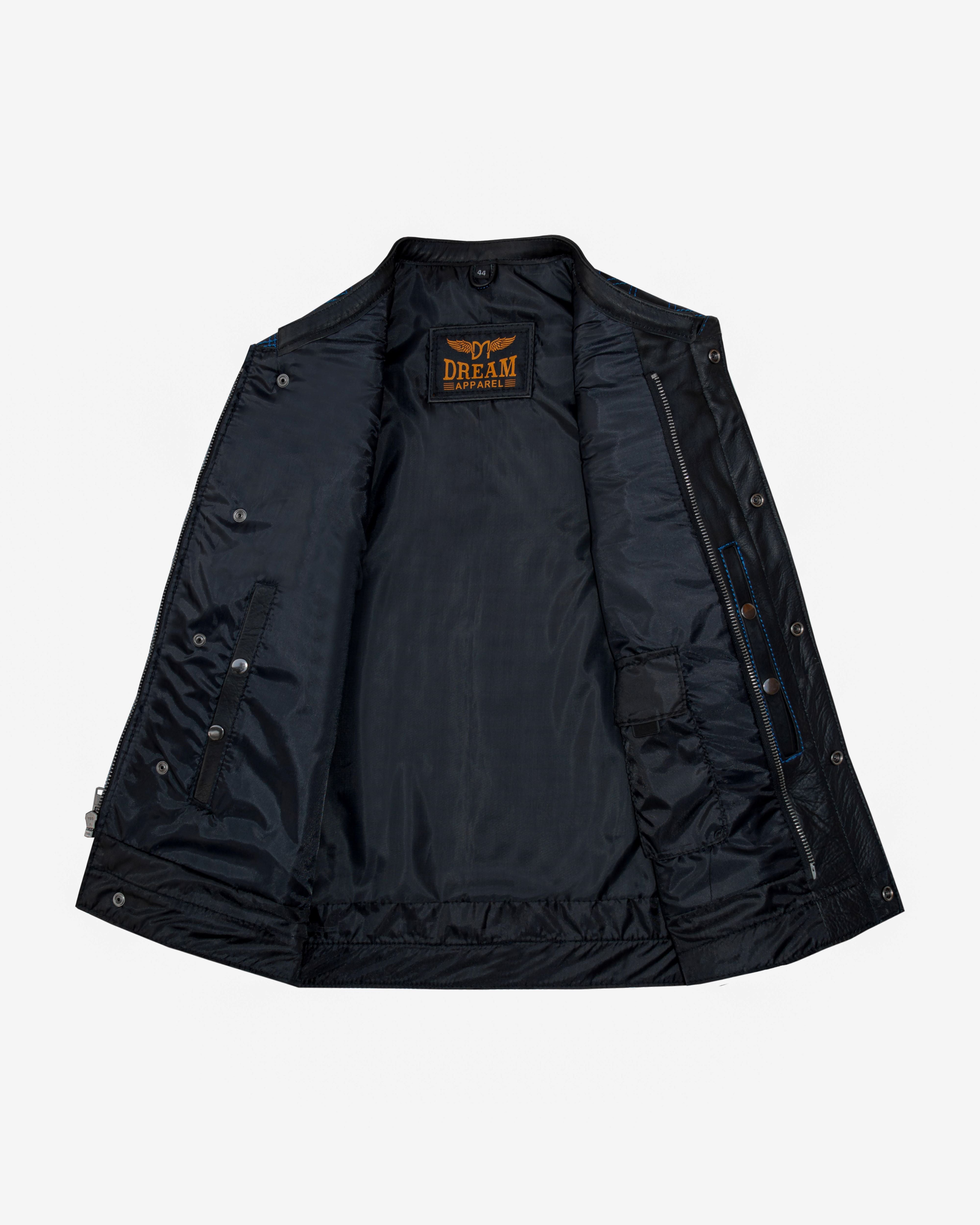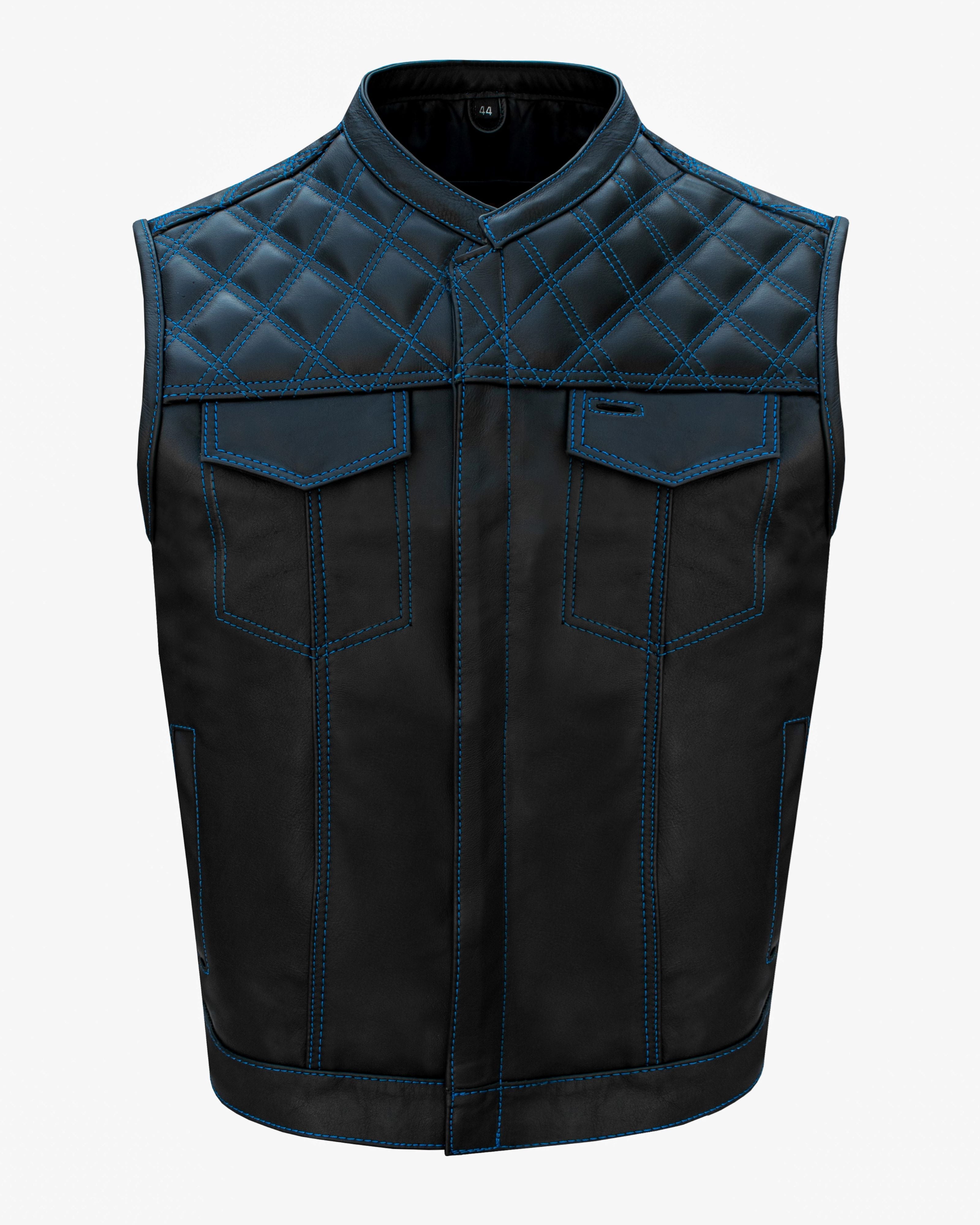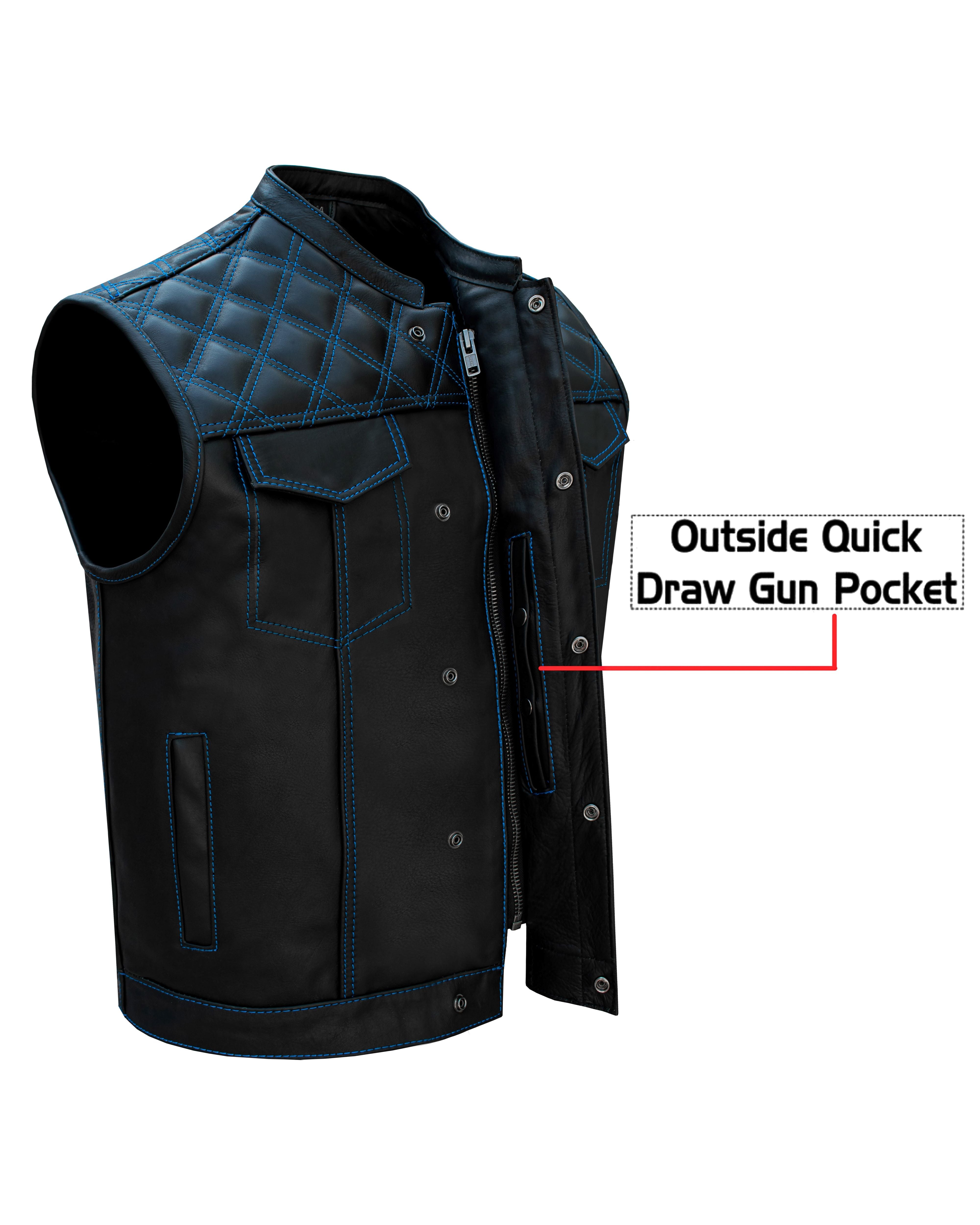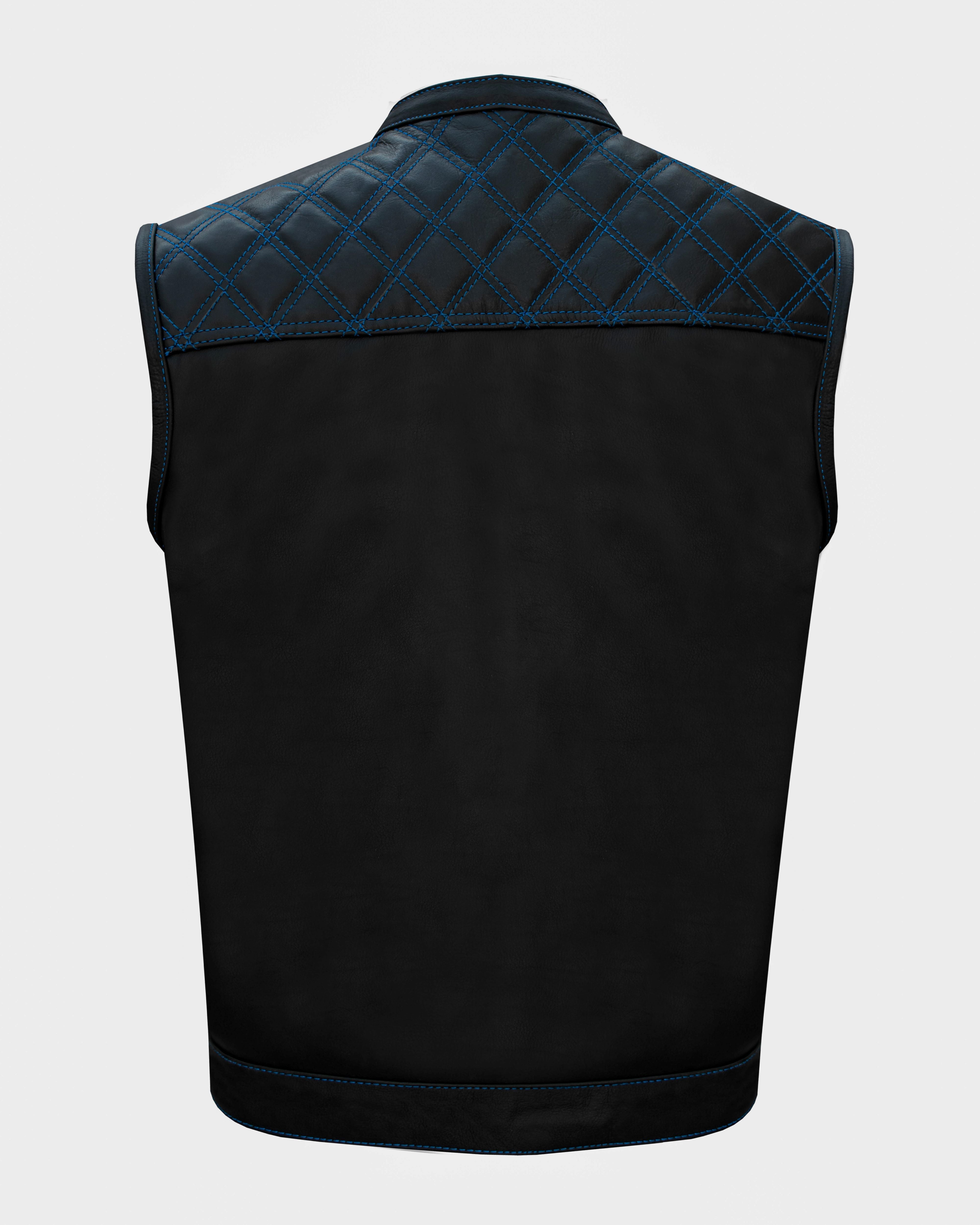 Dream Apparel Mens Black Club Vest Diamond Design Blue Thread Premium Cowhide Leather