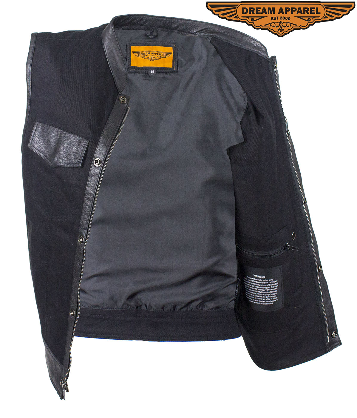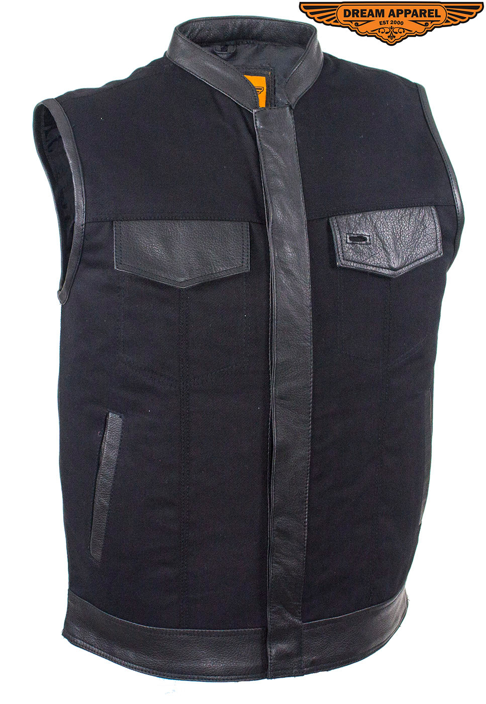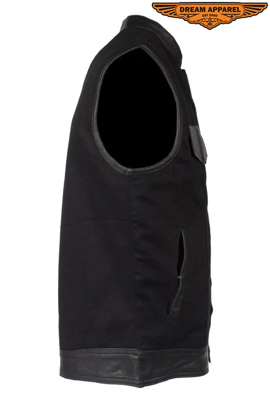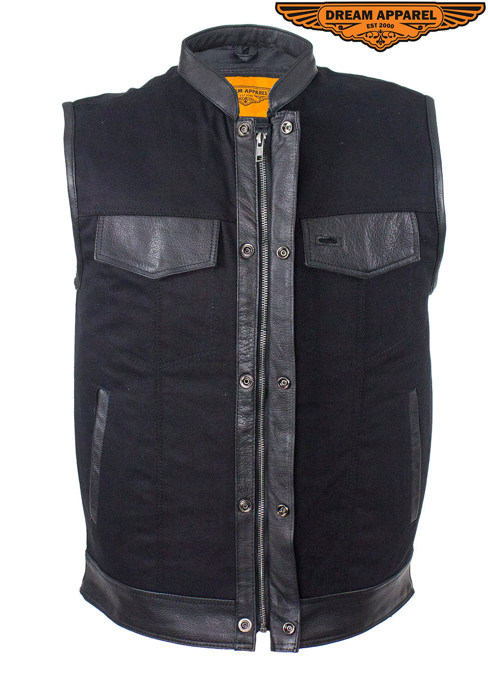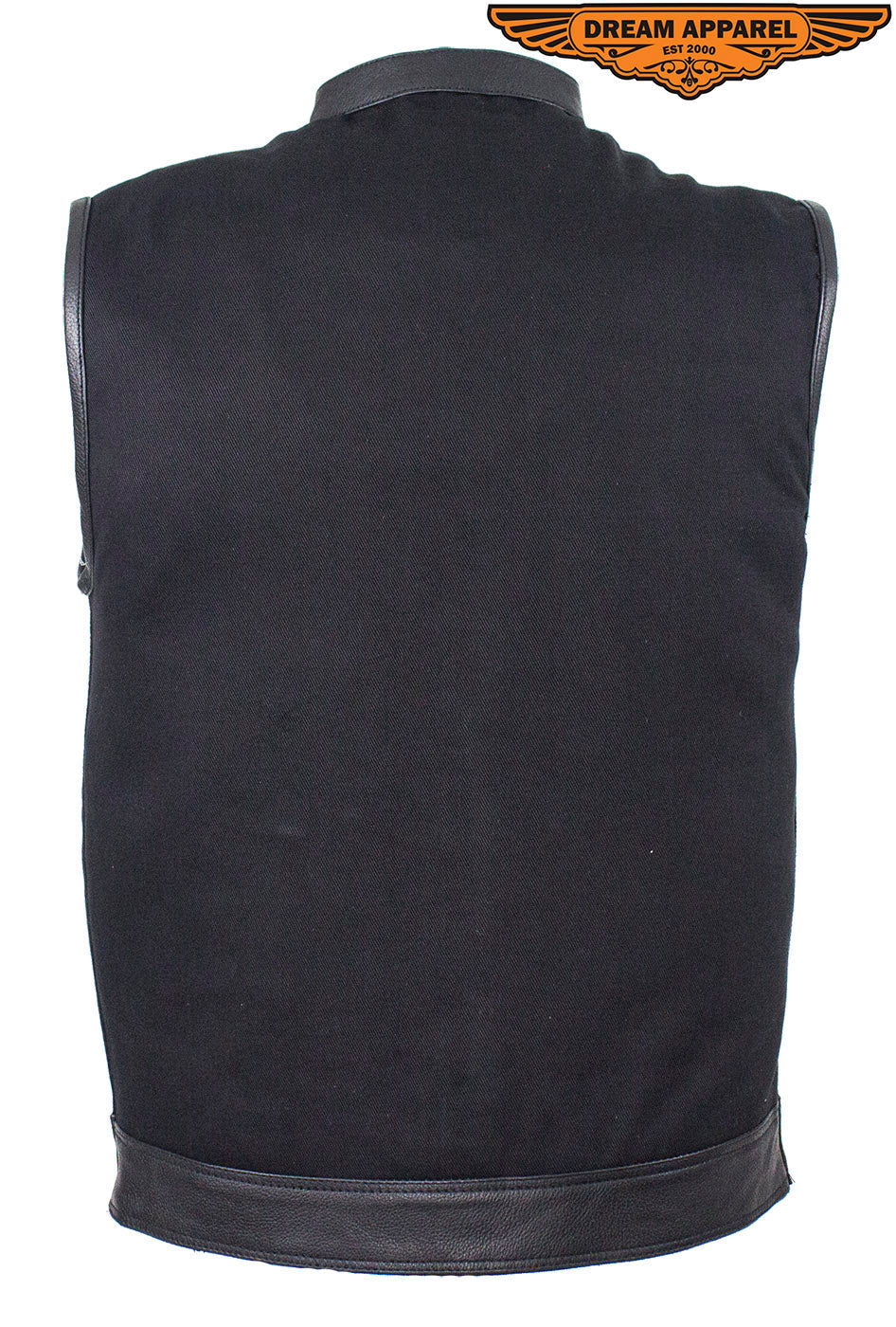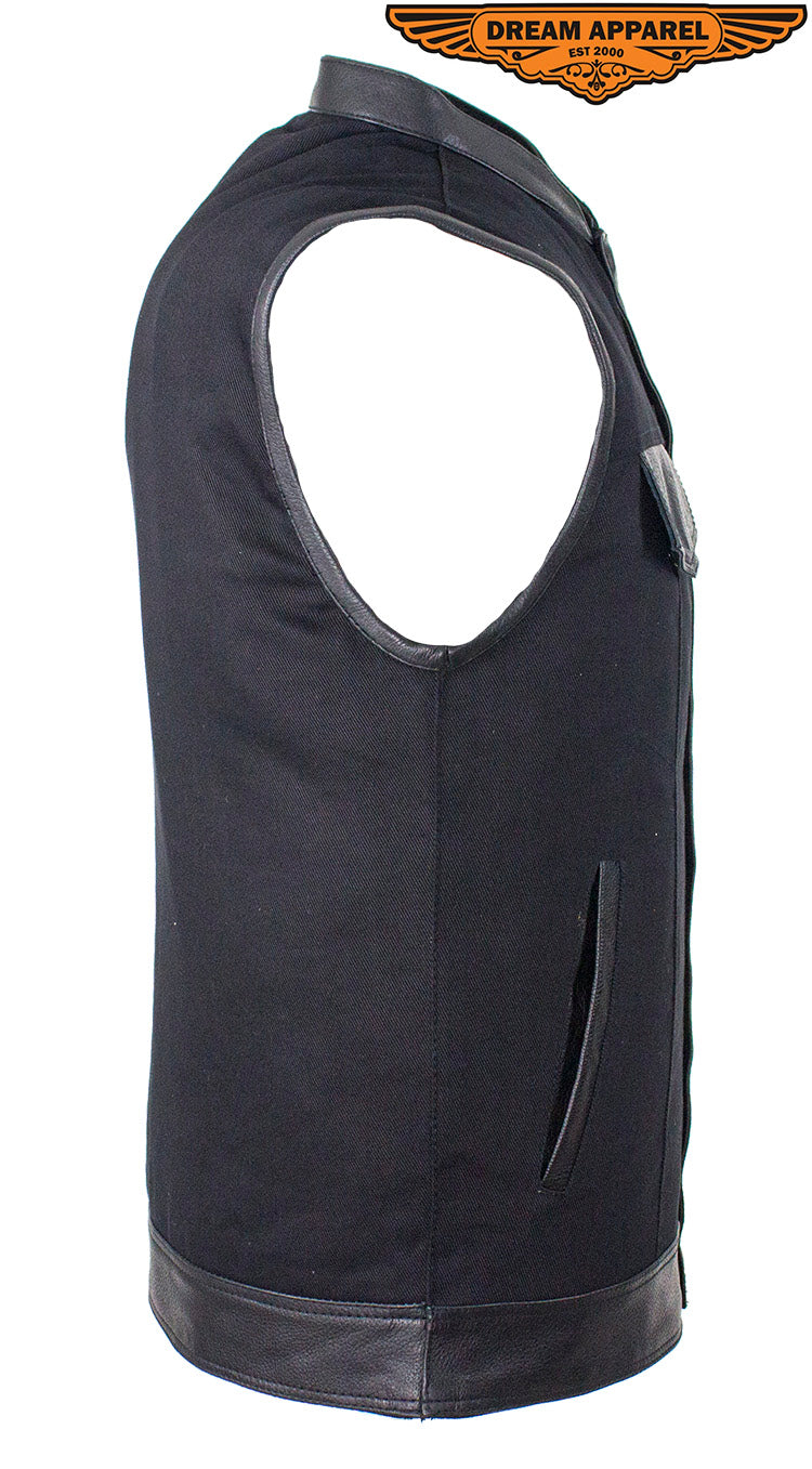 Mens Black Denim Biker Vest With Leather Trims & Front Zip Up