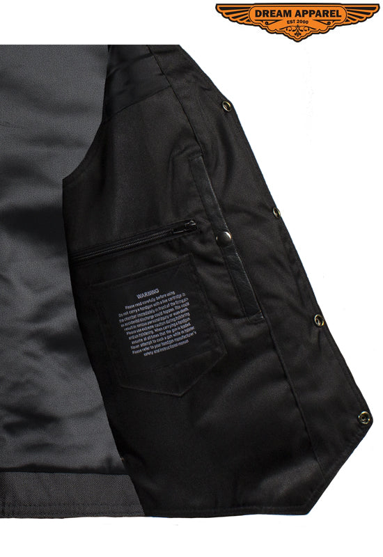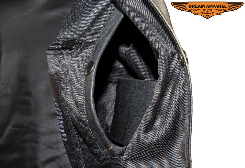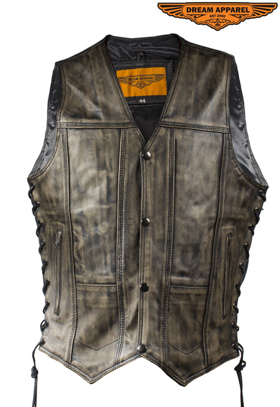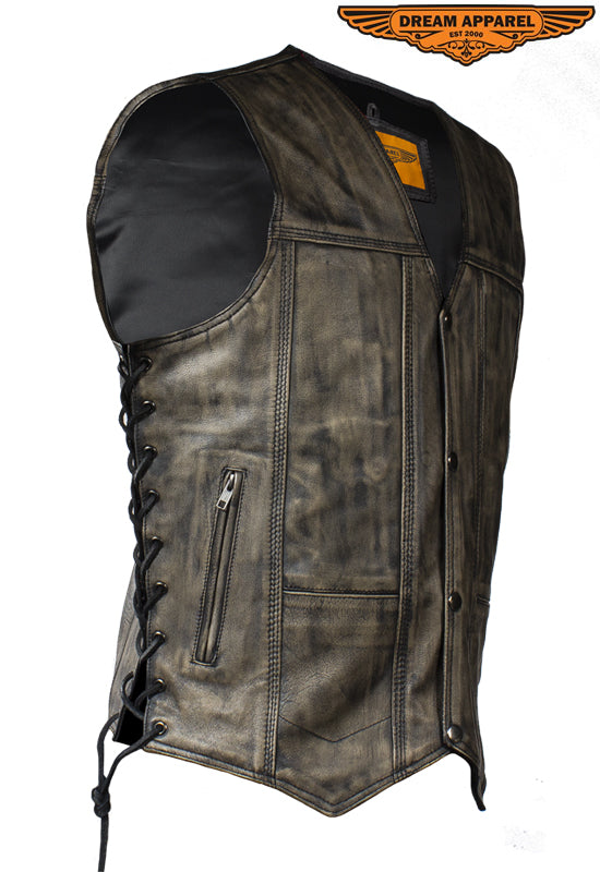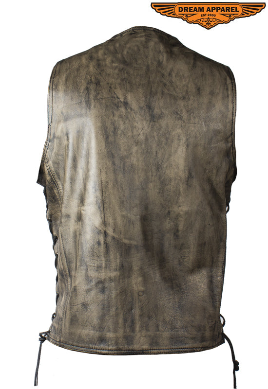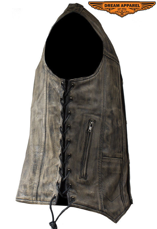 Mens Distressed Brown Motorcycle Vest With 10 Pockets Side Laces