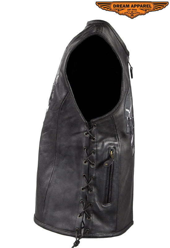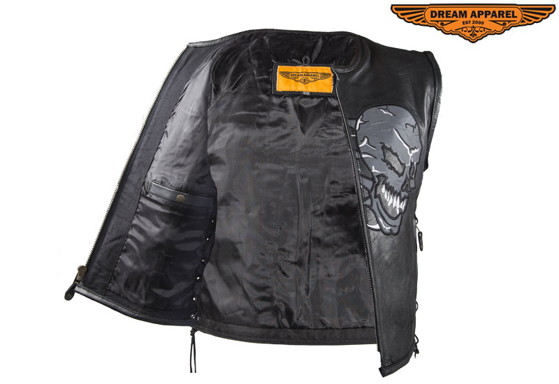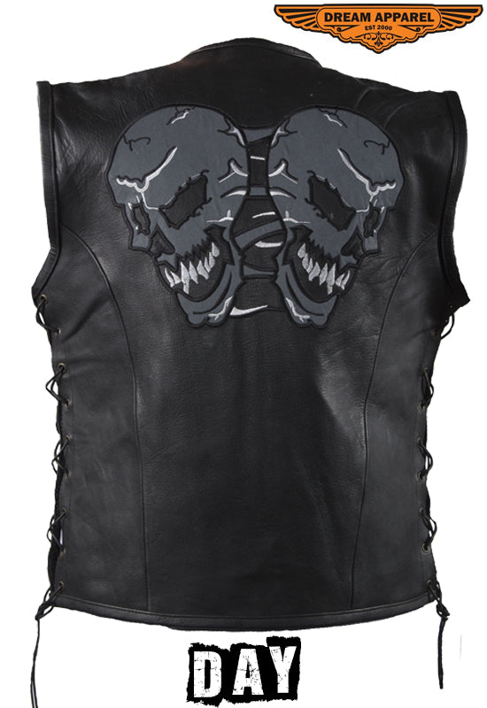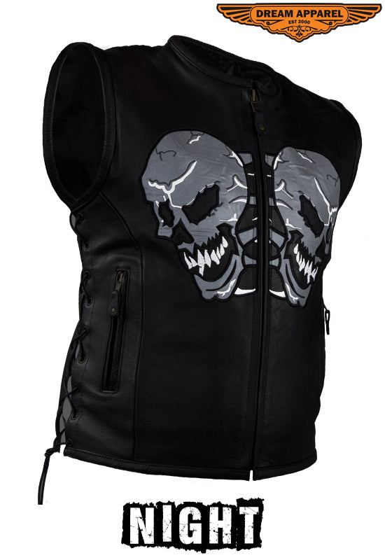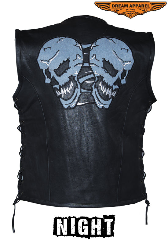 Mens Leather Vest With Reflective Evil Skulls