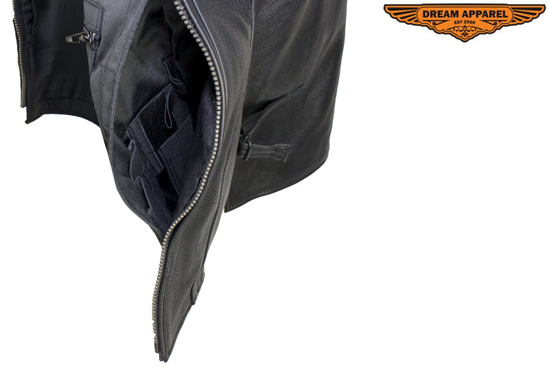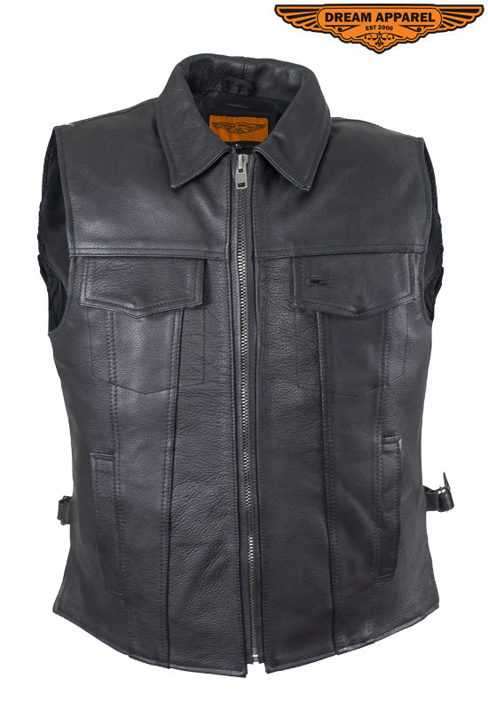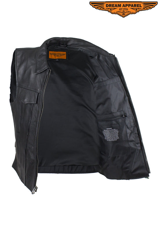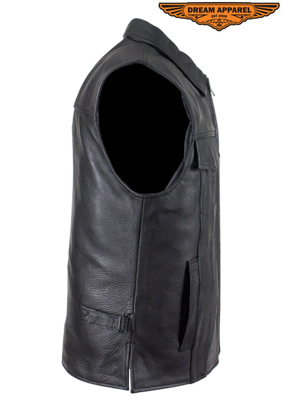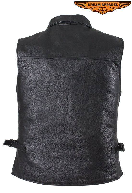 Mens Motorcycle Club Leather Vest With Fold Collar & Hidden Snaps
