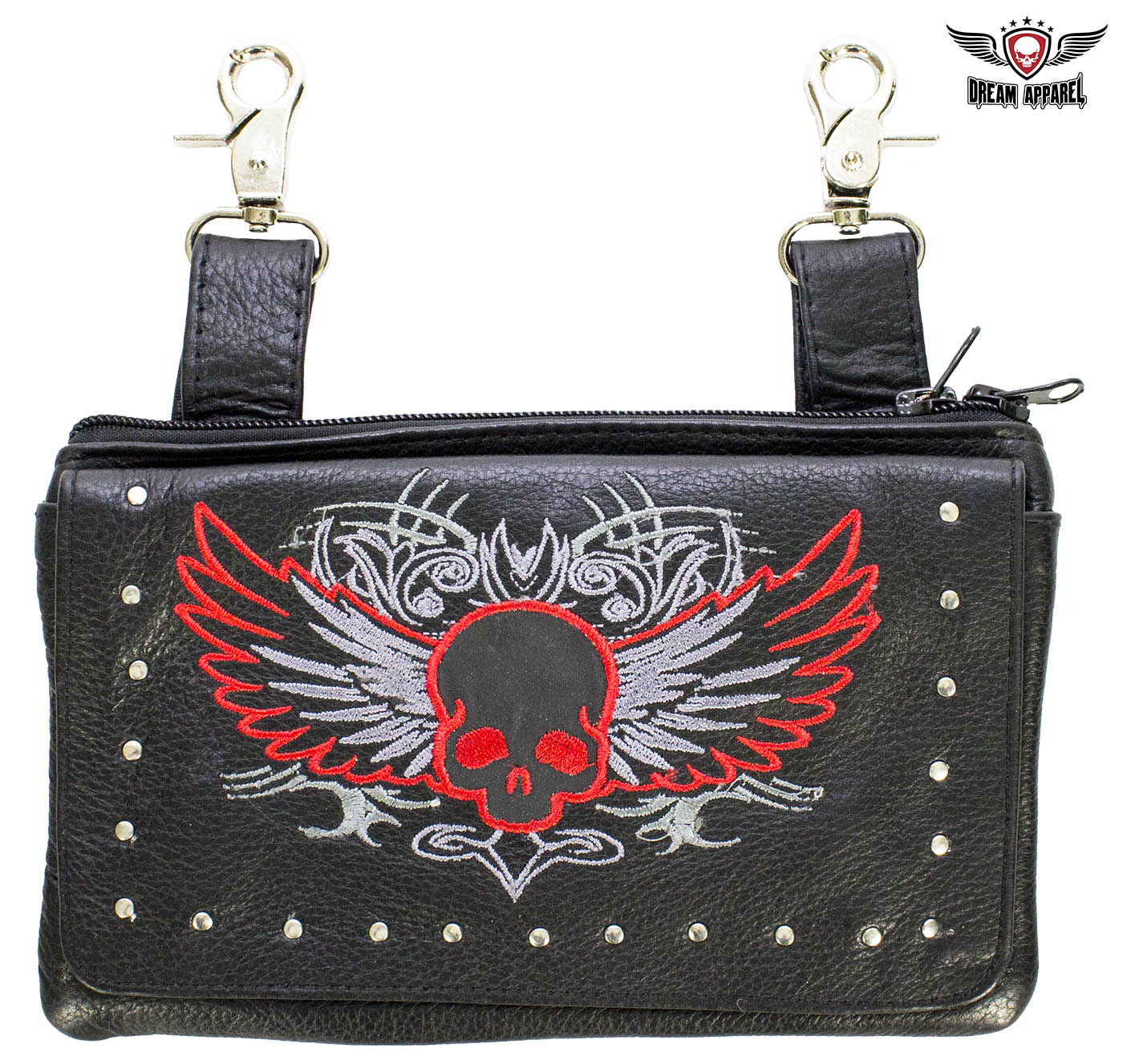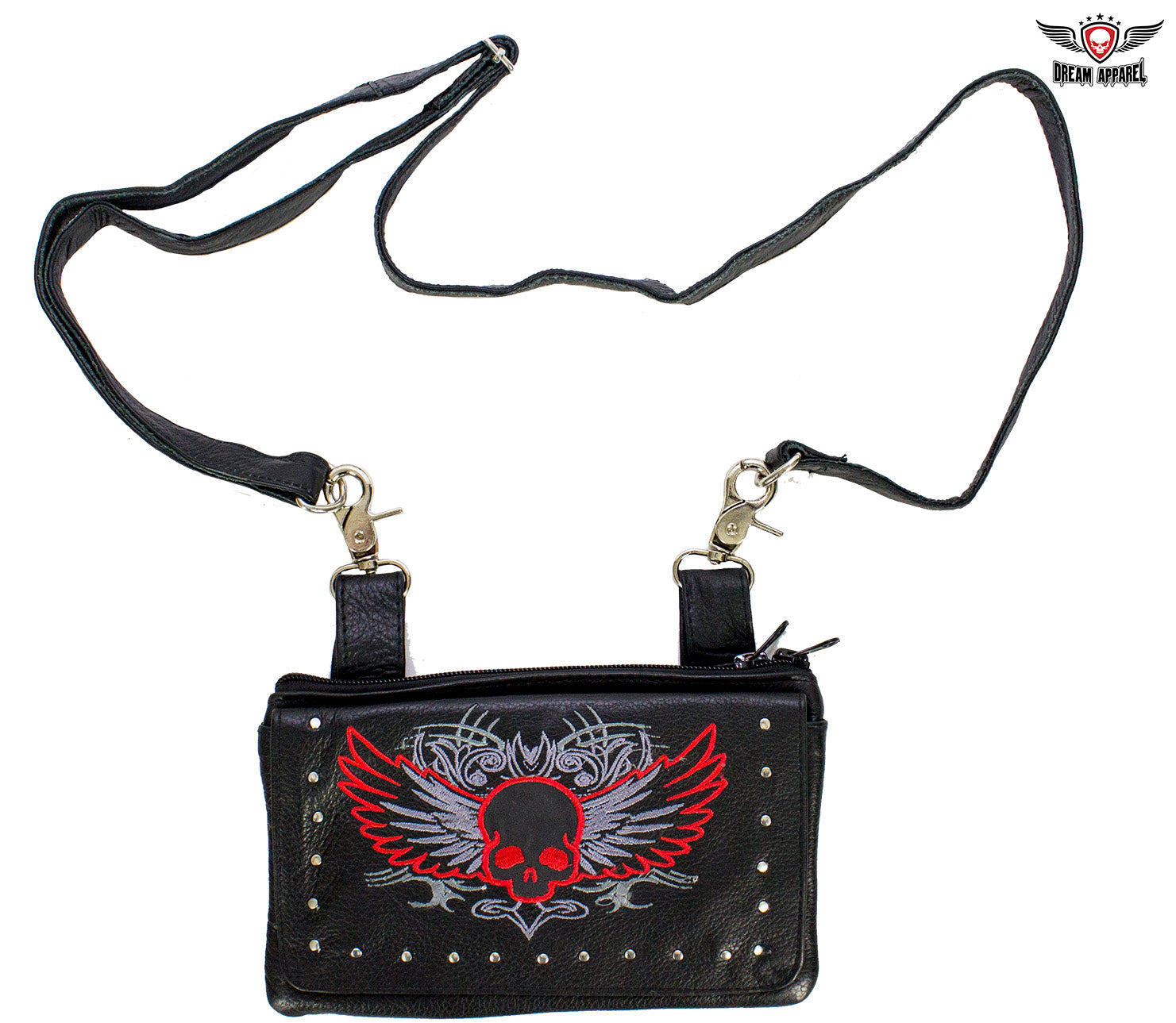 Studded Naked Cowhide Leather Red Skull Belt Bag