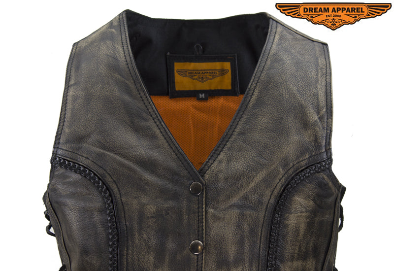 Dream Apparel Womens Longer Cut Distressed Brown Cowhide Leather Motorcycle Vest