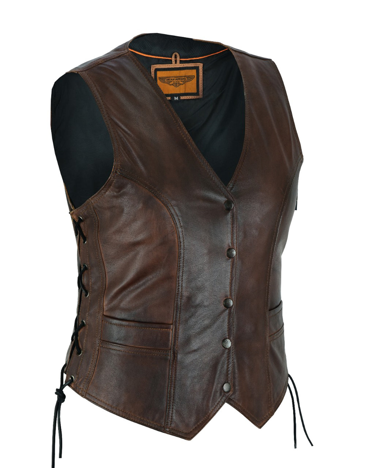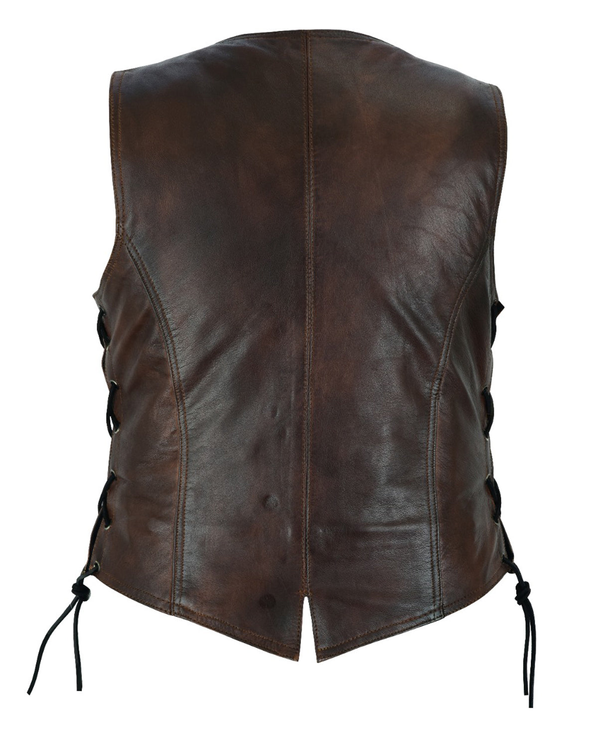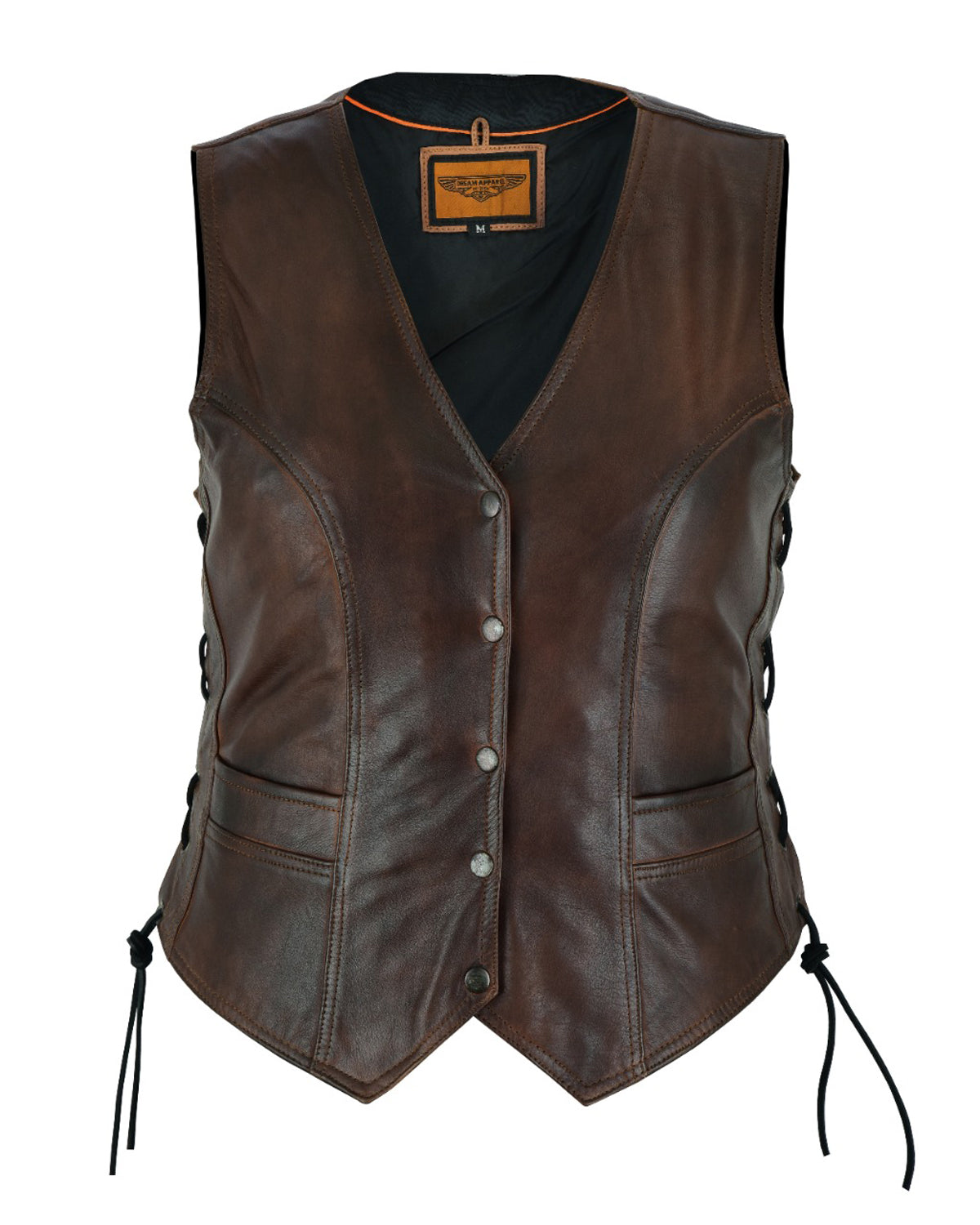 Womens Brown Cowhide Leather Motorcycle Vest Side Laces