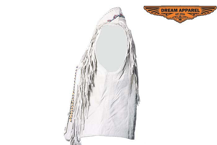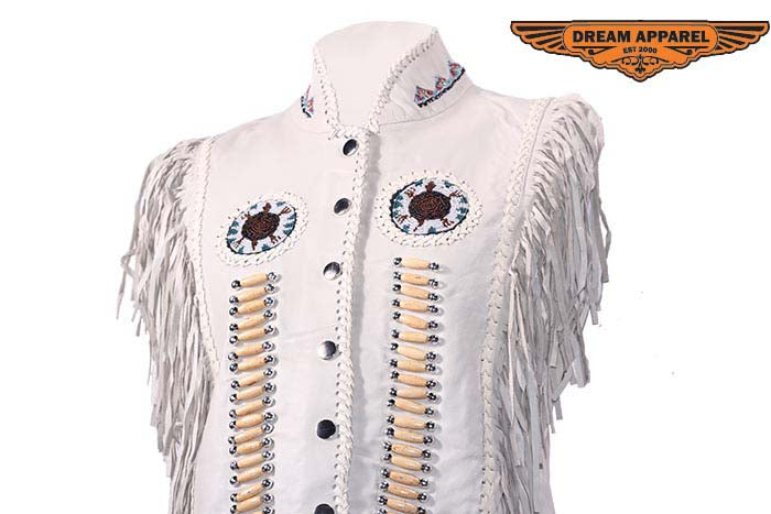 Womens Leather Snap Up Vest With Bones & Beads